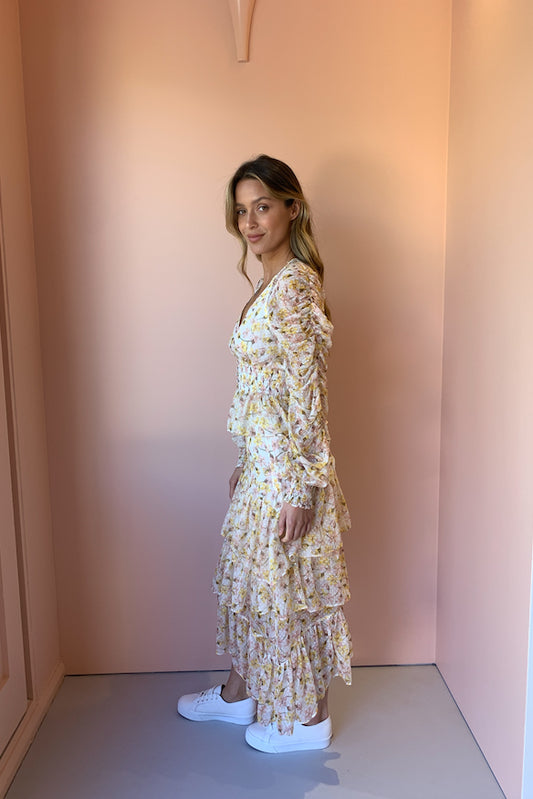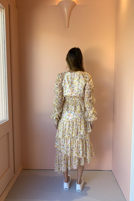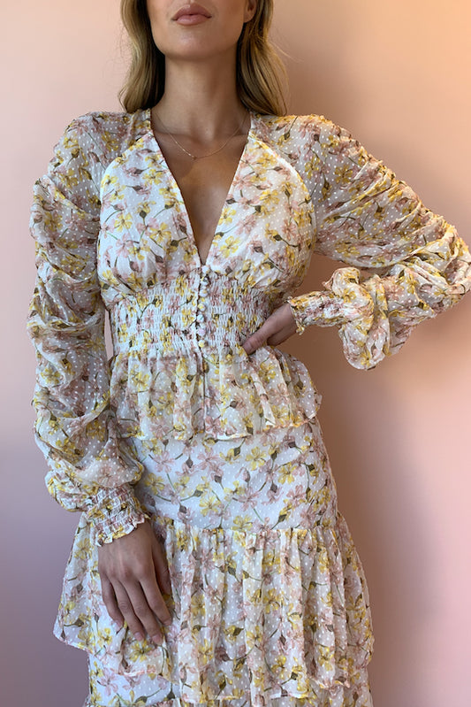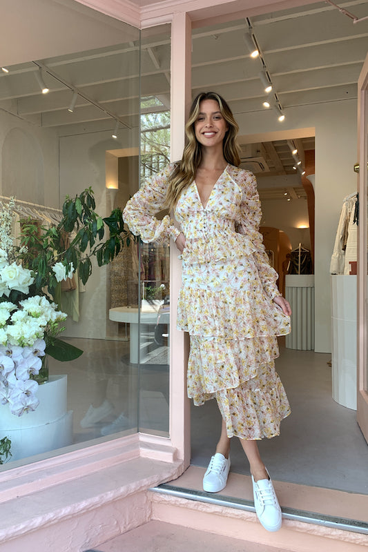 The Hansen & Gretel ‘Sherese’ top a feminine style, cut in their exclusive seasonal Garden Print. Featuring a deep v-neckline and a fitted waist panel with rouleau loop buttoning down the front. A gathered full length sleeve, and an elasticated cuff for an exaggerated sleeve. The Sherese is perfectly paired with our Hansen and Gretel Esme skirt for a matching look.