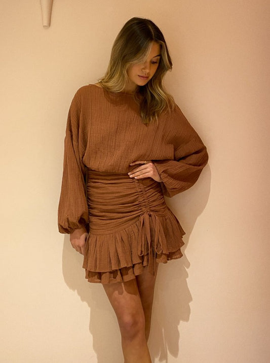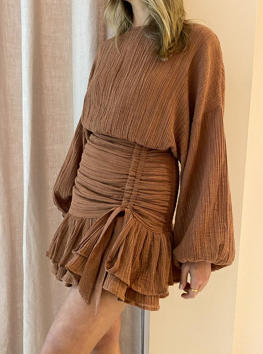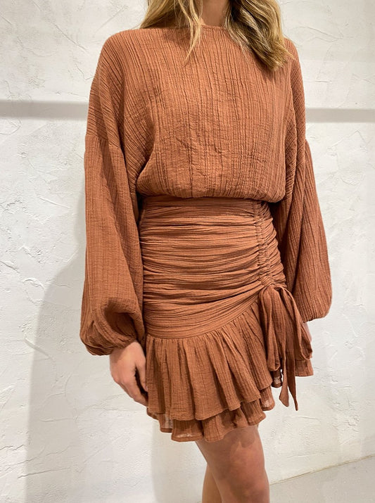 Crafted from a crinkle textured linen cotton blend, this mini moment features romantic long blouson sleeves with elasticated cuffs and intricate shirring detail on the back of the skirt.