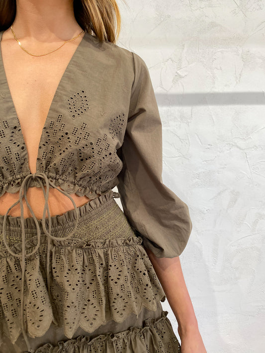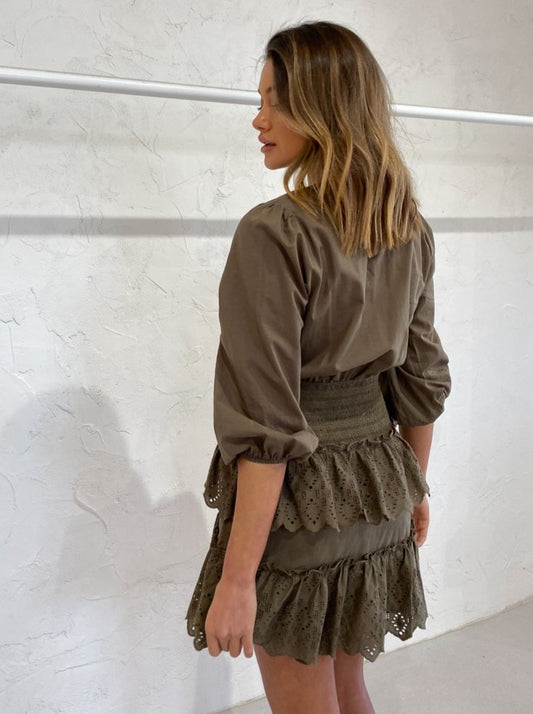 The eyelet detailing, front cut out and shirred waistband will have you stepping out in style time and time again.