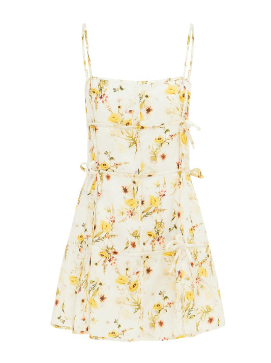 Crafted from a delicate Linen fabrication, this mini dress slips on with ease, sits fitted at the bust and features adjustable tie up shoulder straps, a straight neckline and tie detailing.