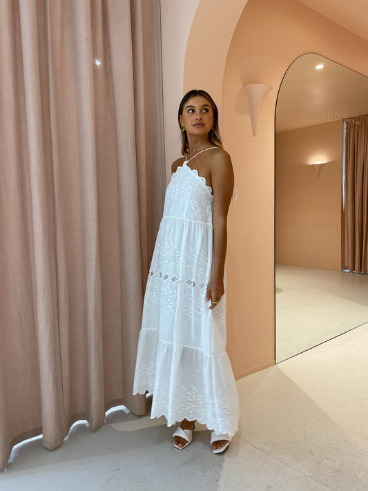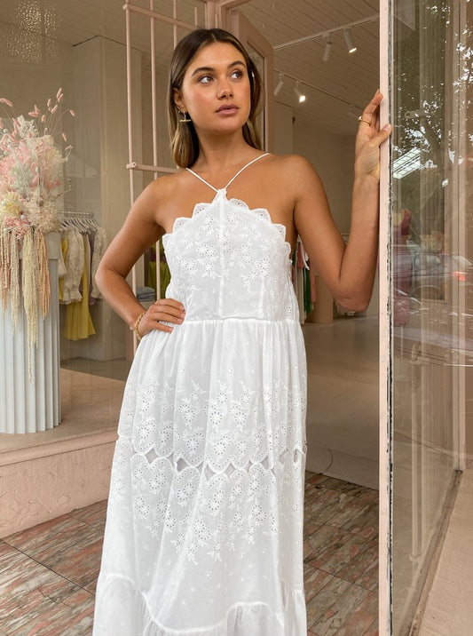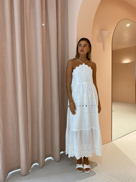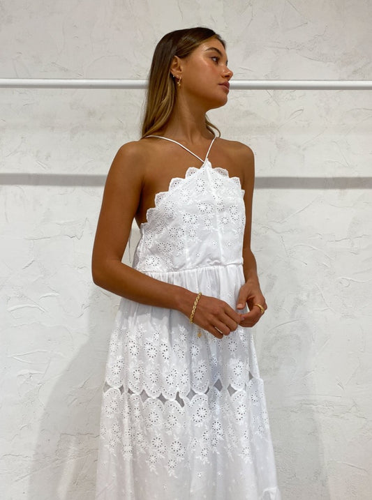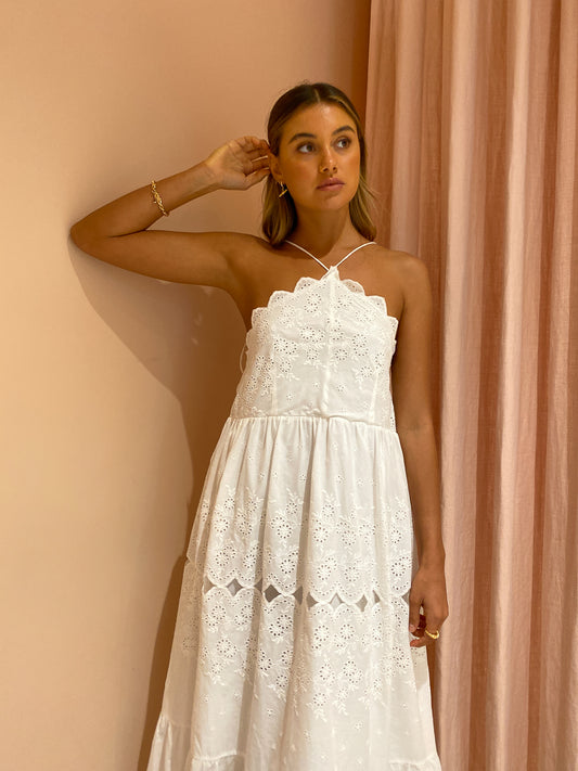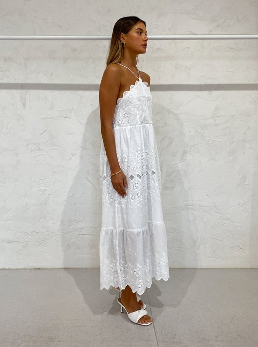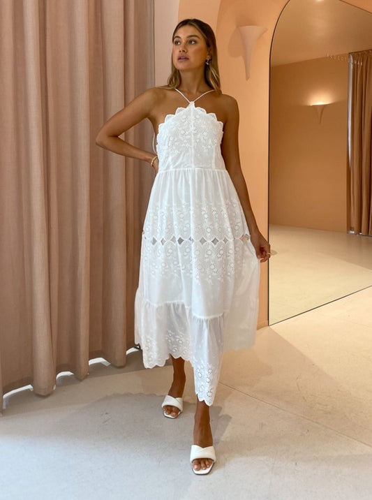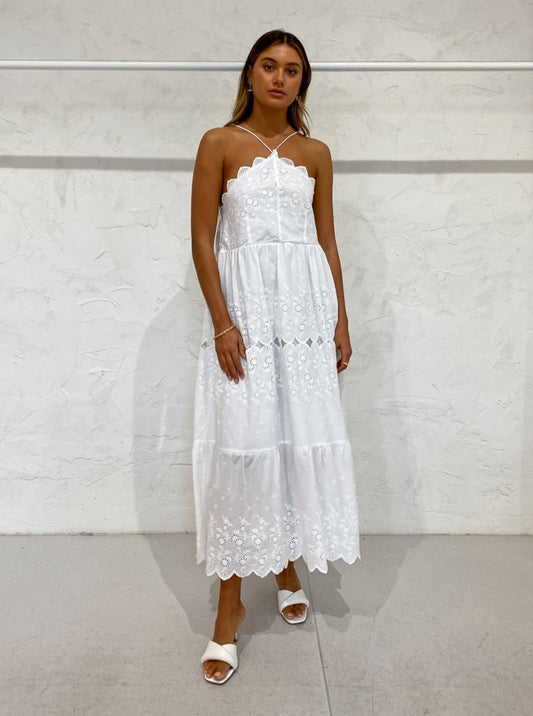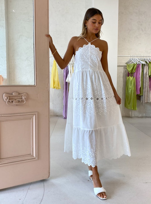 The Issy Sunnyvale Dress in White is designed in a Cotton Eyelet fabric with a tiered silhouette, halter neckline and an elastic back with adjustable rouleau ties for a comfortable fit.