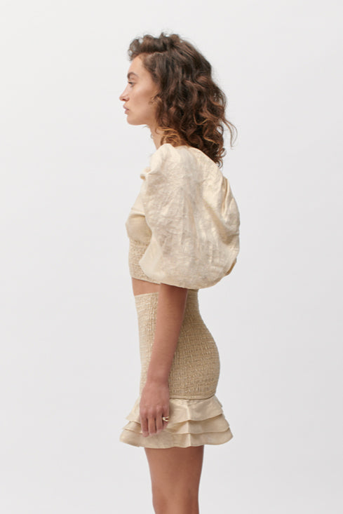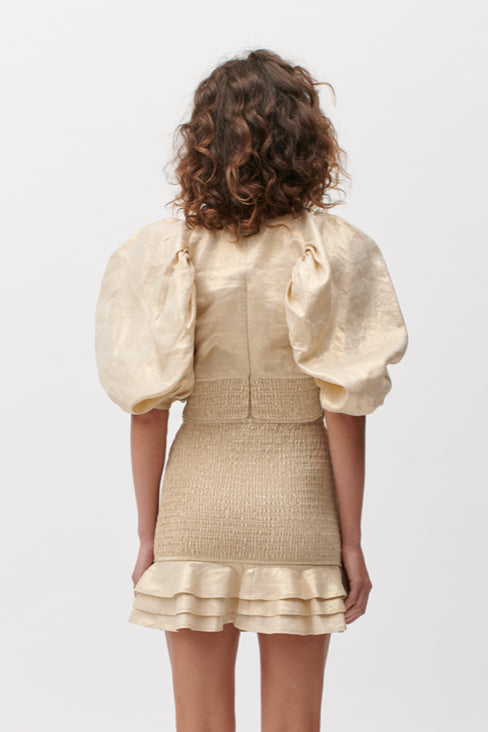 The Joslin 'Lucille' metallic linen shirred mini skirt is a natural flax linen batiste with metallic gold foiling and can be worn as both a top and skirt. What we love most about this piece is the multi-tiered ruffle hem-line with elastic shirring.