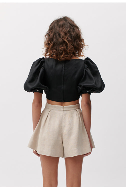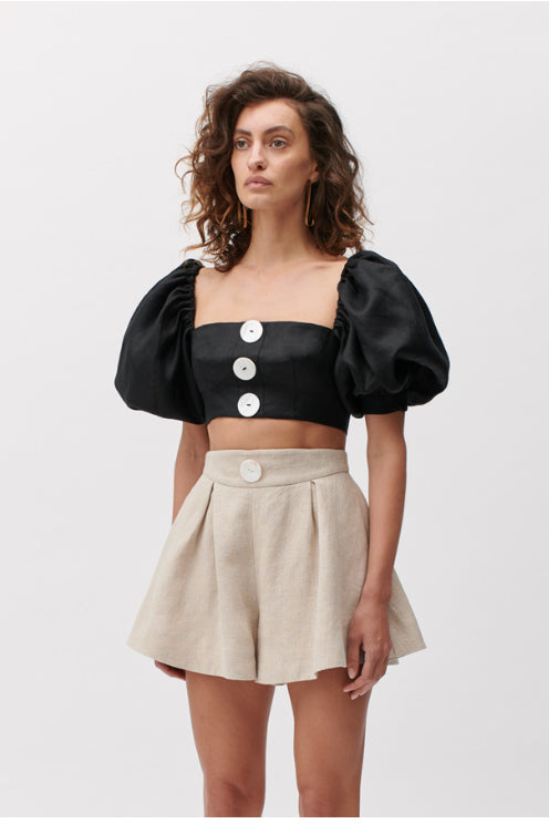 We love the Joslin 'Rosalia' ramie shell top in Black. This cropped bodice style top features balloon styled sleeves, bust crop detailing and polished shell buttons down the centre front.