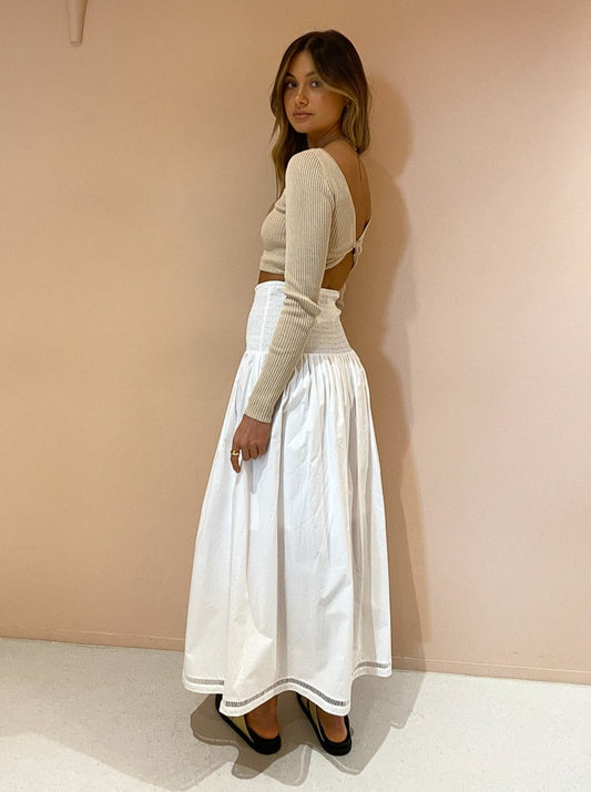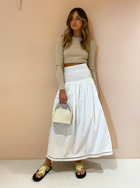 Thoughtfully crafted from an organic cotton poplin, the Yoko Skirt features an elasticised shirred bodice or waistline for endless comfort, falling into a relaxed voluminous skirt with a ladder lace insert along the hemline.