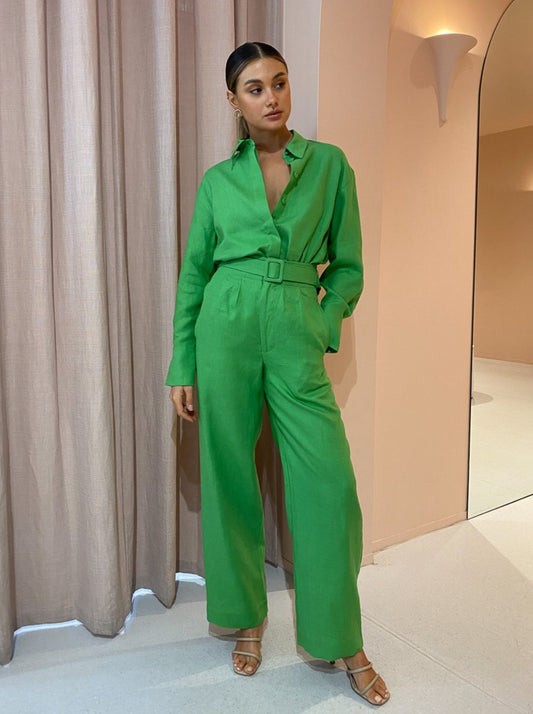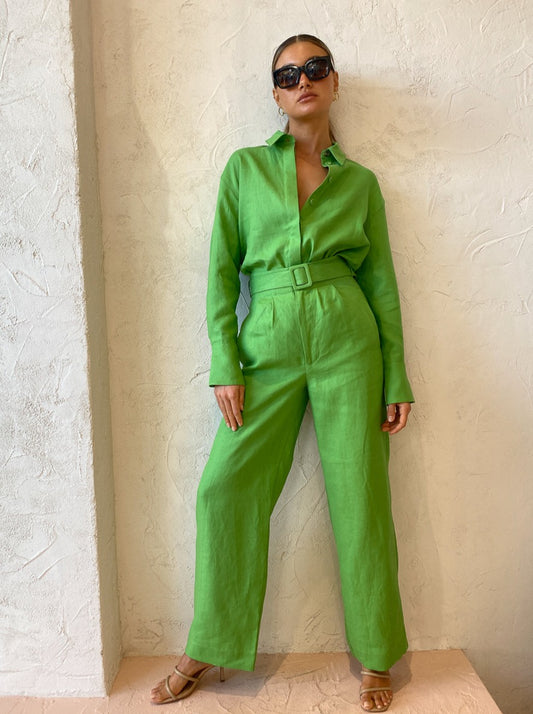 Refresh your set wardrobe with the Devina Relaxed Pant in Moss from Kate Ford.