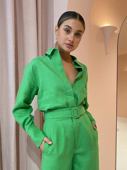 Make a statement in the Devina Relaxed Pant styled with the matching Kate Ford Devina Oversized Shirt in Moss, Alias Mae Lilian Heel in Natural, Porter Harp Earrings in Gold and Vieux Chartreux in Olive Grove.