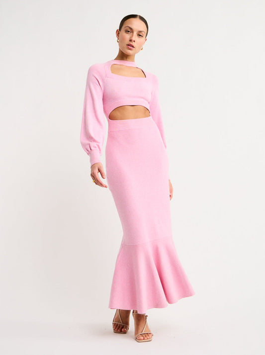 Delicately crafted from a knit fabrication, this dress features long sleeves, a high neckline, cutout on the bust, thick elasticated waistband and elasticated cuff sleeves.