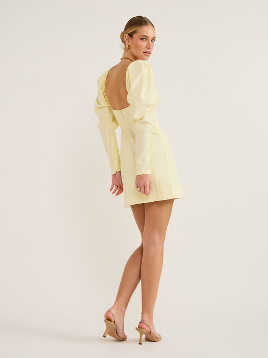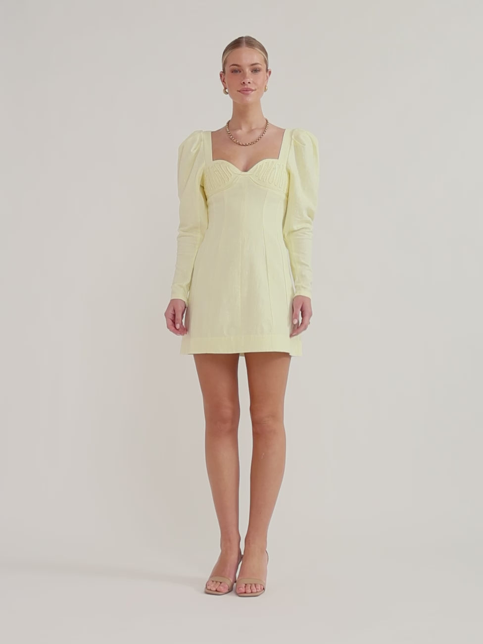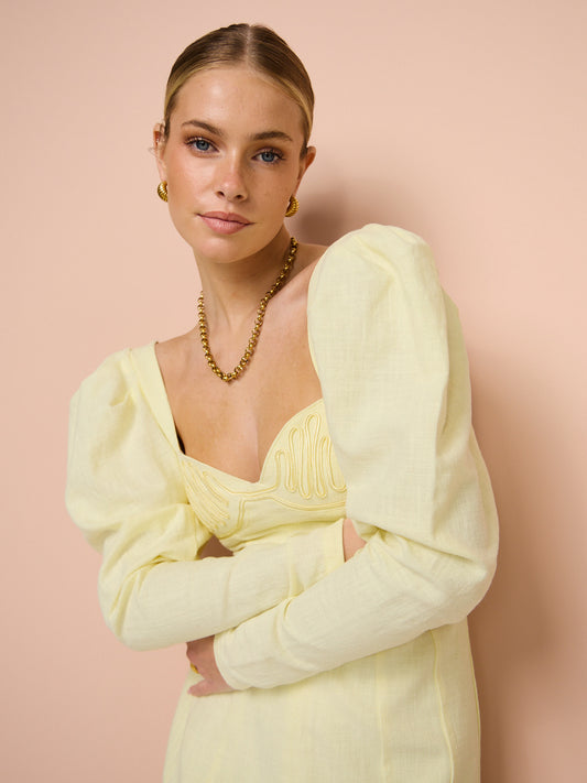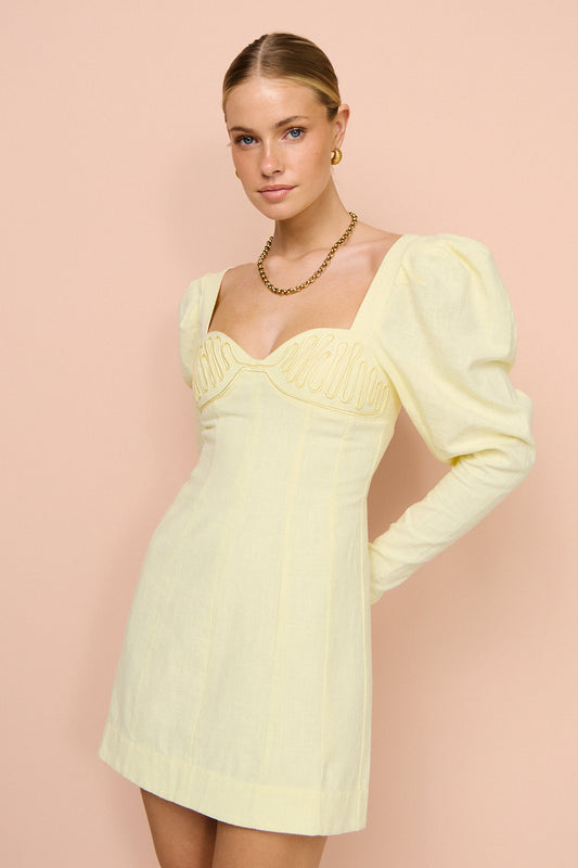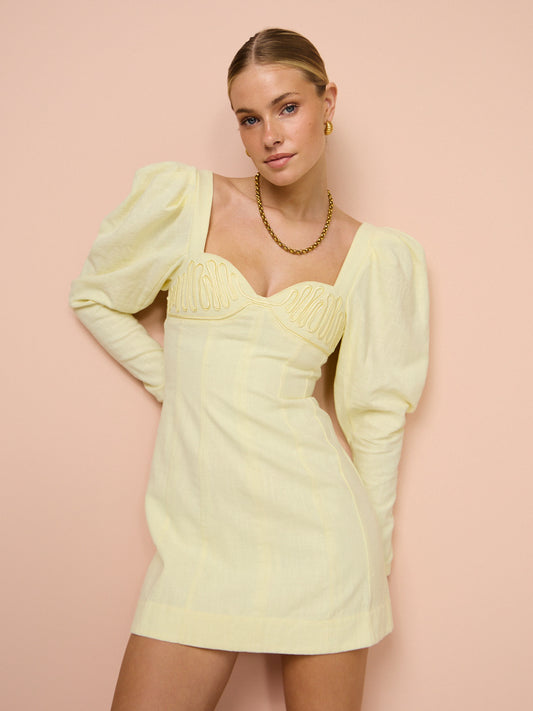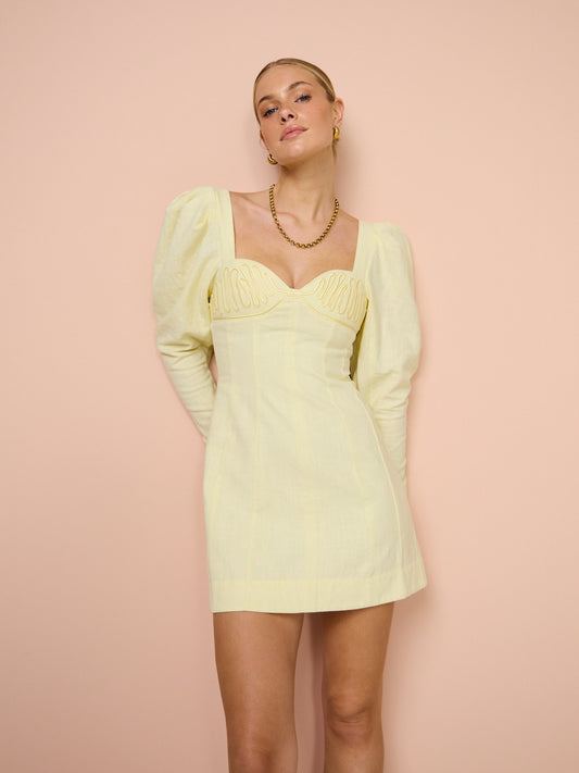 Achieve a timelessly elegant look with the Leyla Embroidered Mini Dress in Limoncello from Clea.