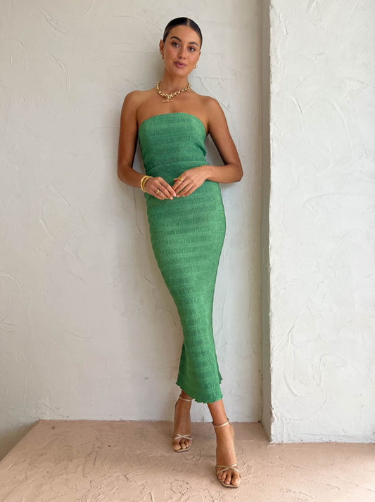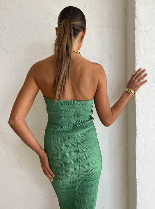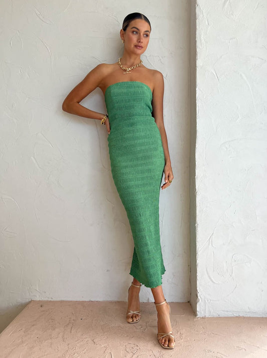Crafted from L'IDÉE smocking pleat fabrication in an earthy Sea Green hue, this stunning strapless midi is an easy to wear silhouette. Sitting fitted at the bodice to flatter and gently fluted at the hem to the female form effortlessly.