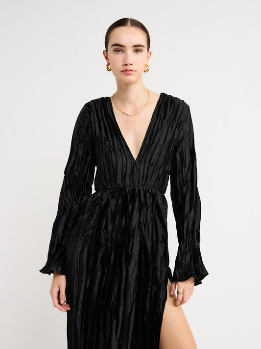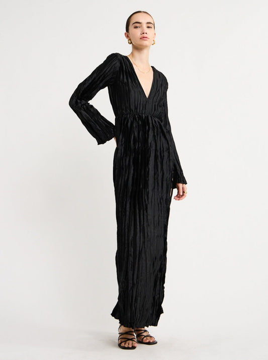 Crafted from a delicate crushed pleat fabrication, this sophisticated gown features a striking silhouette of a deep V-neckline and back with an exaggerated long sleeve and high waistline with a rear zip closure.