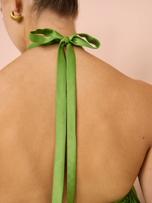 This playful mini features a three tiered umbrella silhouette with a dainty tie-up halter style neck.