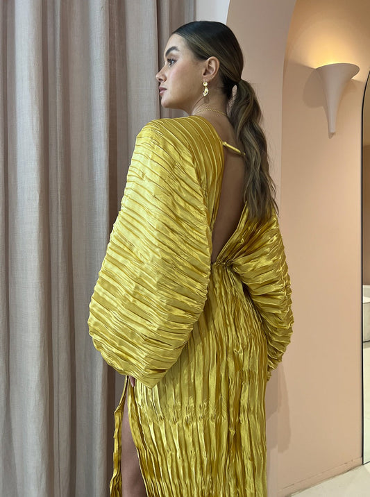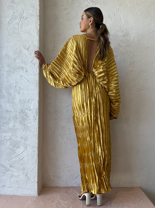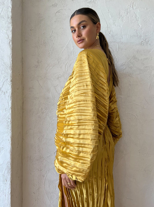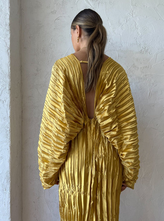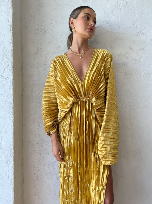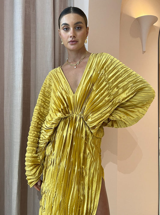 Thoughtfully crafted from a signature pleated polyester fabrication with an incredible lustre, this sculptural silhouette has been designed to embrace the female form. With a statement v neckline, drop shoulders and exaggerated kimono sleeves that are perfectly balanced with a high waistline and straight midi length skirt.