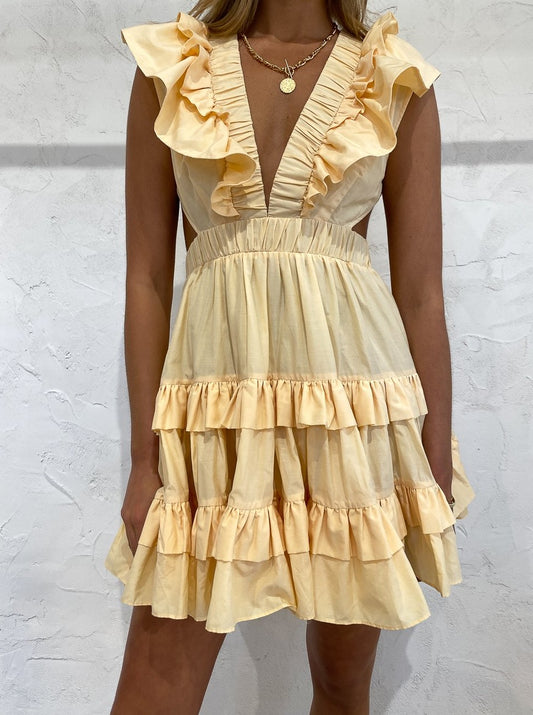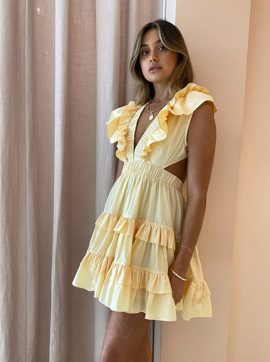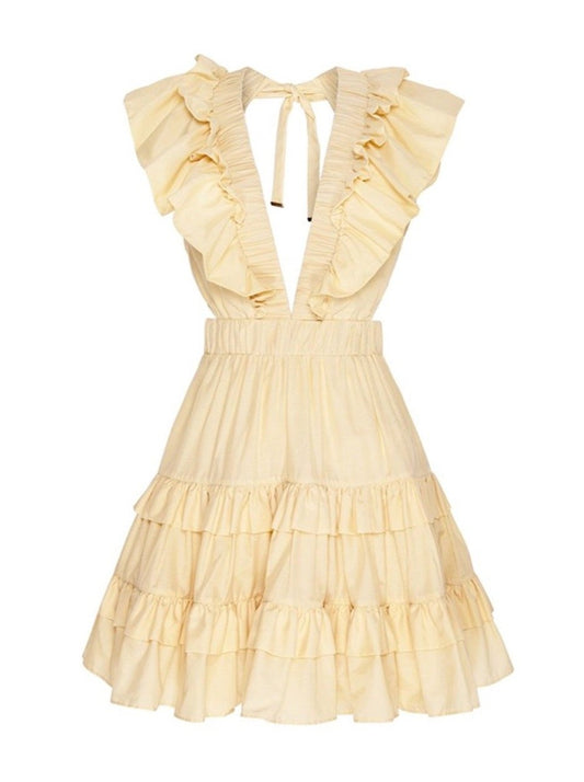Delicately crafted using a soft and breathable cotton silk blend, this statement mini silhouette features a plunging v neckline with an open back and adjustable ruffle detailed shoulder straps that tie in a delicate bow behind the neck.