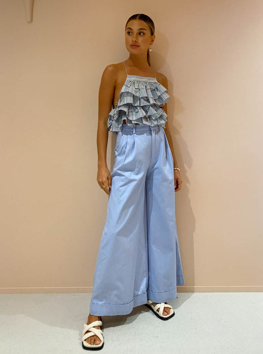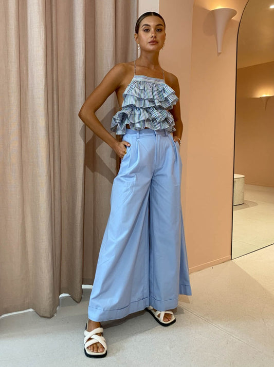 For your next long lunch complete with Magali Pascal Georgina Pant in Hydrangea, Emelie Belt in WhiteAlohas Slip on Cross Sandal in Ivory, Porter Heritage in Gold and Porter Wave Croissant Earrings in Gold. Transition into the night with Alias Mae Aspen Heel in Natural.