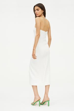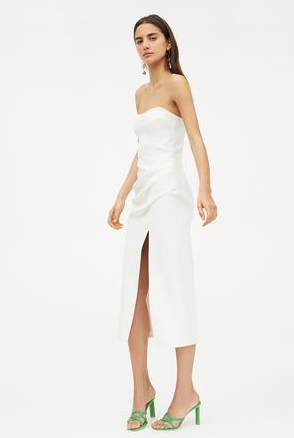 Slim fitting and midi length, the Hit Predictor Strapless Dress is perfect for balmy evenings. Featuring an asymmetric waistline and tuck details on the skirt, with an alluring front side slit. Internal boning in the bodice creates a flattering and fitted look. Cut in a medium weight viscose blend with a subtle stretch.