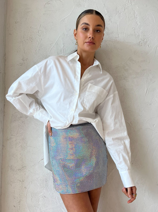 Style with the Manning Cartell Platinum Queen Mini Skirt in Silver and the Manning Cartell Show Stopper Heel in LimePorter Hammered Ring in Spliced, Brie Leon Signature Flower Pendant Necklace in Gold, Porter Pond Ring in Gold, Porter Heirloom Bangle 6mm in Gold, Porter Pond Earrings in Gold and the Amber Seats Hudson Bracelet