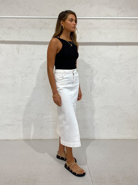 The Manning Cartell Unbleached Tones Denim Midi Skirt in Off White is the classic piece to bring into your transeasonal wardrobe.