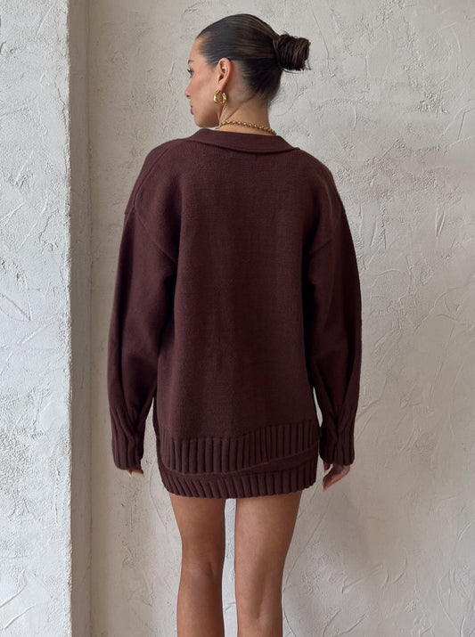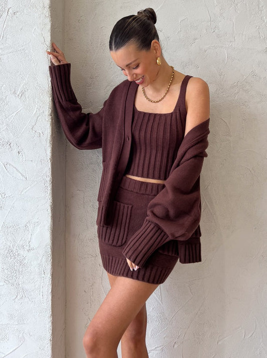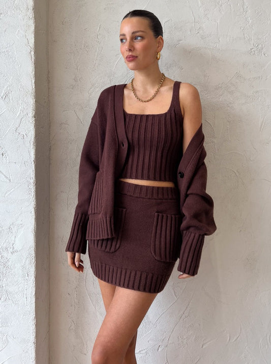 Crafted from a textured jersey knit in a seasonal mahogany hue, this knitted mini hugs your body to create a flattering silhouette. The contrasting wide rib trims, and hip patch pockets add a textured flair that pairs back perfectly with the Hudson Cardigan Set in Mahogany.