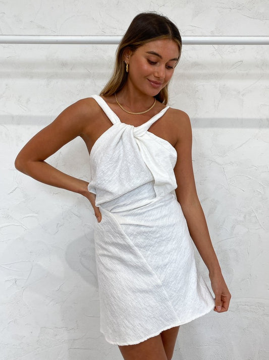 Designed with a bias cut, knot neckline and a low-cut back, this elegant mini dress will forever be timeless and on trend.