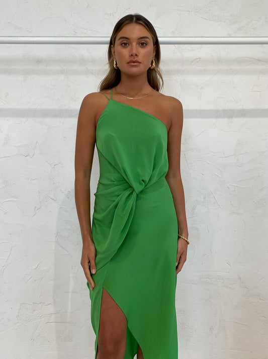 This vibrant silk dress, with the draped bodice and assymetrical skirt, sits effortlessly on the body.