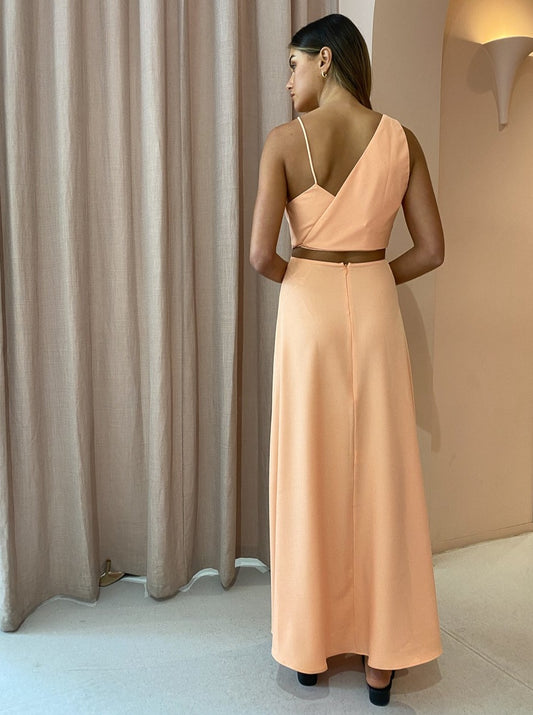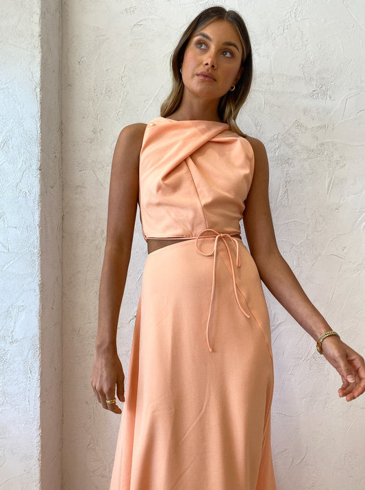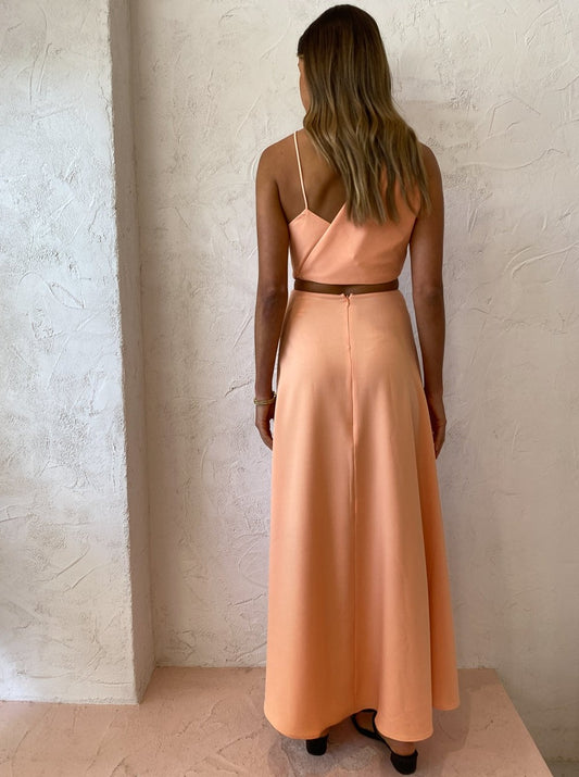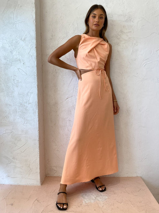 A timeless and elegant maxi length silhouette, the Bijoux is a sleeveless dress cut from a mid-weight pastel Melon hue fabrication. All in the details, we love the high neckline complimented with structured draping across the chest and gentle asymmetric cut outs at the waist.