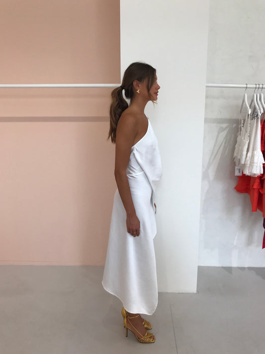 A shoulder-baring asymmetric neckline culminates in flattering drapes and wraps through the waistline for a decidedly feminine finish.