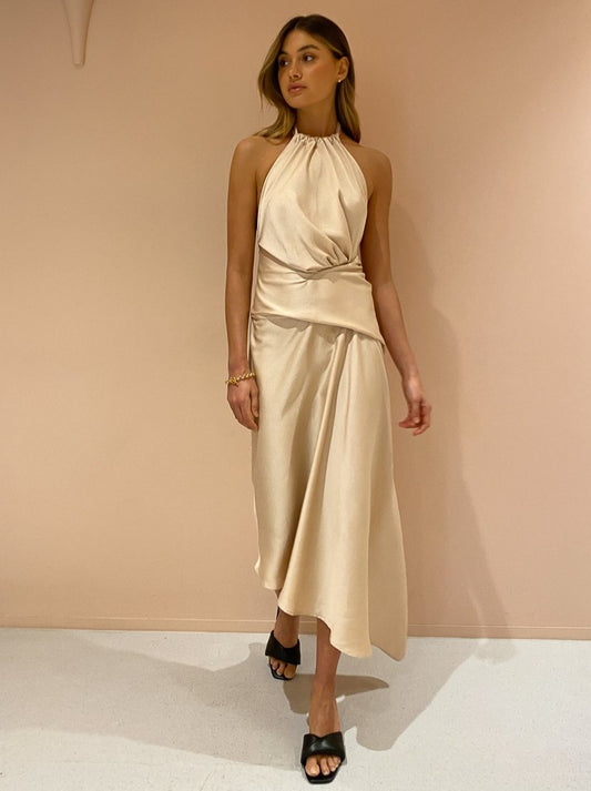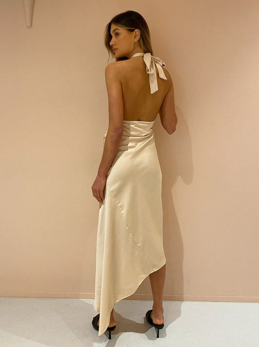 The Oracle dress is cut with an asymmetric hemline, open back and in a midi length. Cinched at the waist, this gathered halter style dress features long neck ties and elevated draping detail across the waist and skirt. Feminine and timeless, the Oracle has it all.
