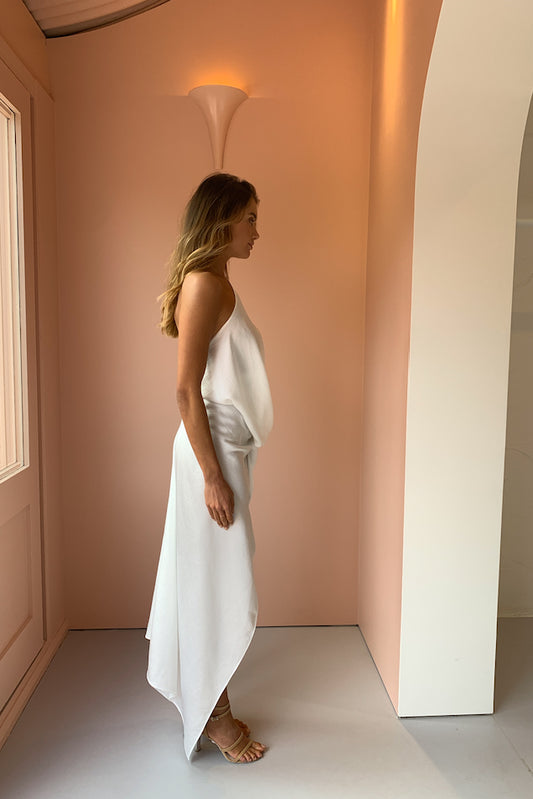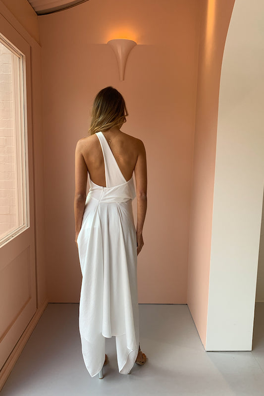 Featuring a thick one shoulder neckline with signature OFS draped detailing on the front and a side split.