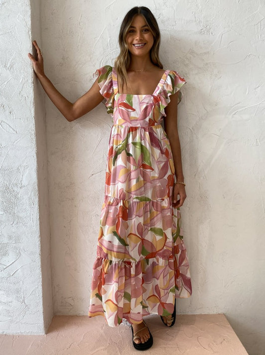 Crafted from a lightweight woven Tencel fabrication, this maxi dress features feminine flutter sleeves and a straight neckline which falls into an A-line tiered maxi skirt.