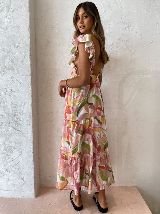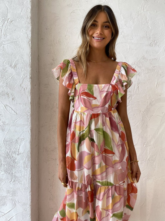 The Carmela Dress in Tutti Fruitti by Ownley is an effortlessly feminine and endlessly sweet midi moment made for sun-filled Coco occasions.