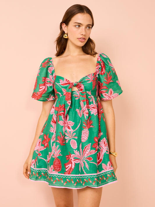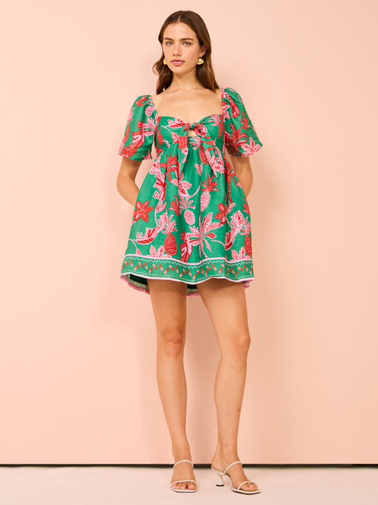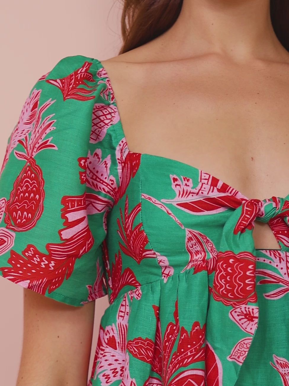 Crafted from a lightweight pineapple print fabric, this mini dress features a sweetheart neckline, tie detailing on the bust, elasticated shirred back, in seam pockets and short sleeves.
