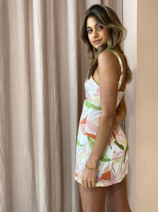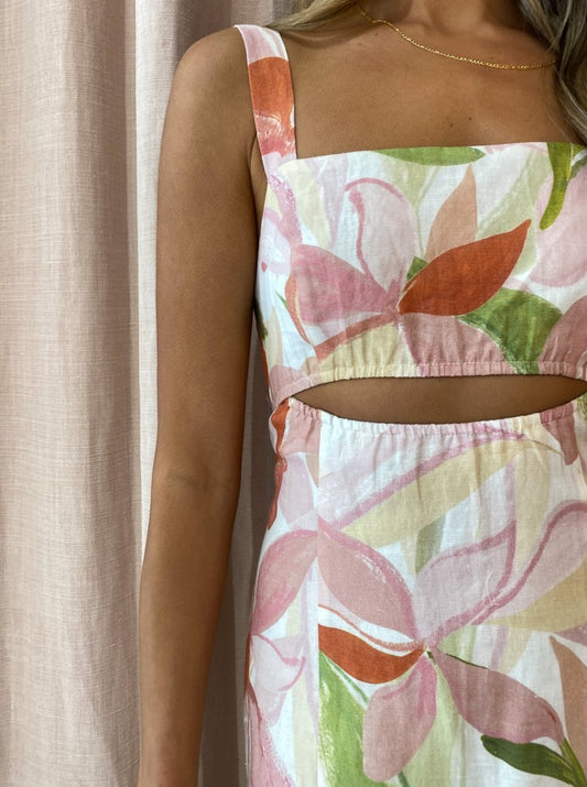 Crafted from a lightweight Linen fabrication, this mini dress features a square neckline, wide straps and a cut out front detail for that minimalistic charming touch.