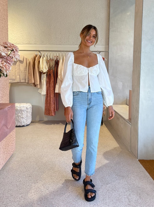 Coco girls love to pair the Riley Top with the EXCLUSIVE Nobody x Coco Kennedy Jean in Calmed for weekend getaways and Sunday brunches.