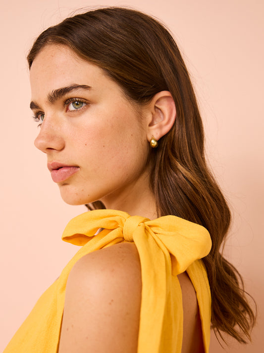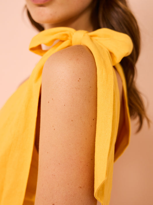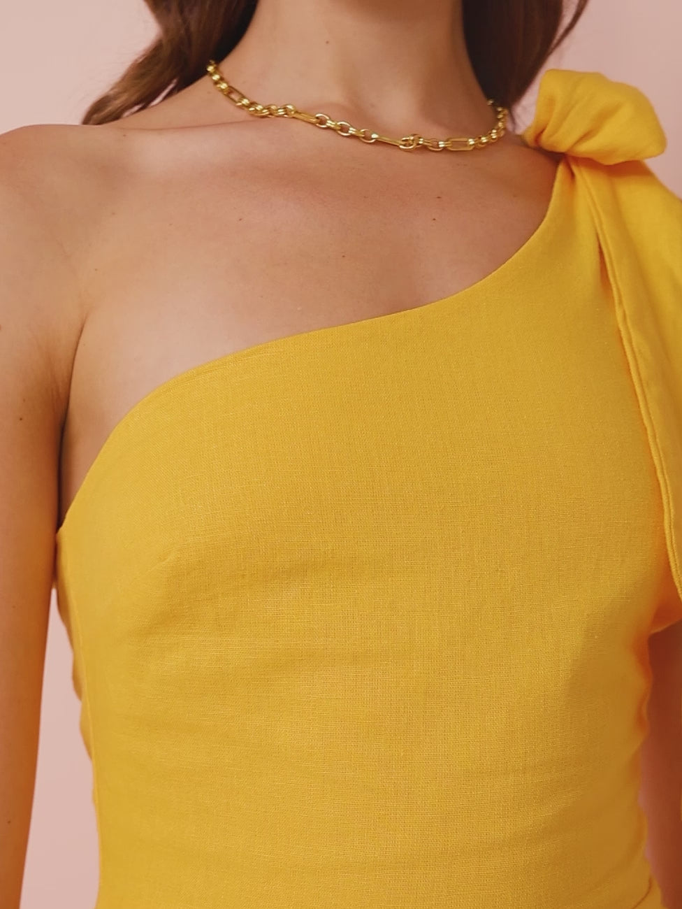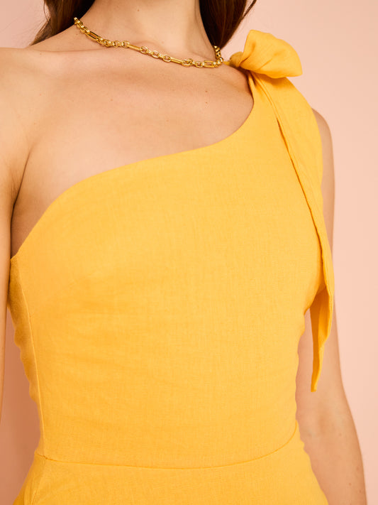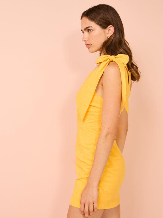 Crafted from a linen blend, this mini dress features an asymmetrical neckline with an exaggerated tie bow detail on the shoulder for a dramatic statement.
