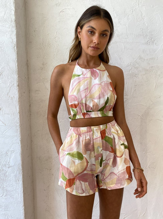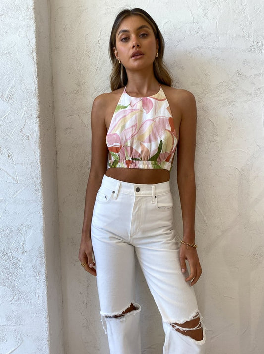 Crafted from a lightweight Linen fabrication, this halter style crop is designed for comfort and to be worn with ease. Cut in a fruity and sweet floral print the Viccy top features an elasticated waistband and a daring exposed back.