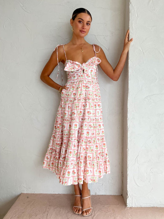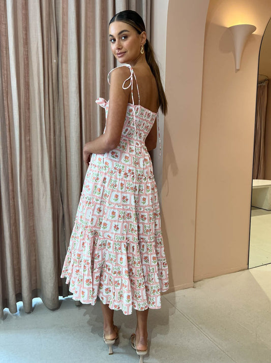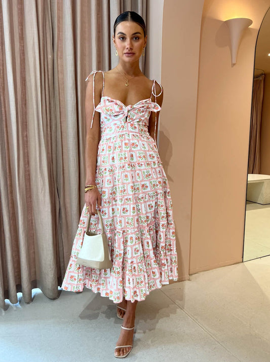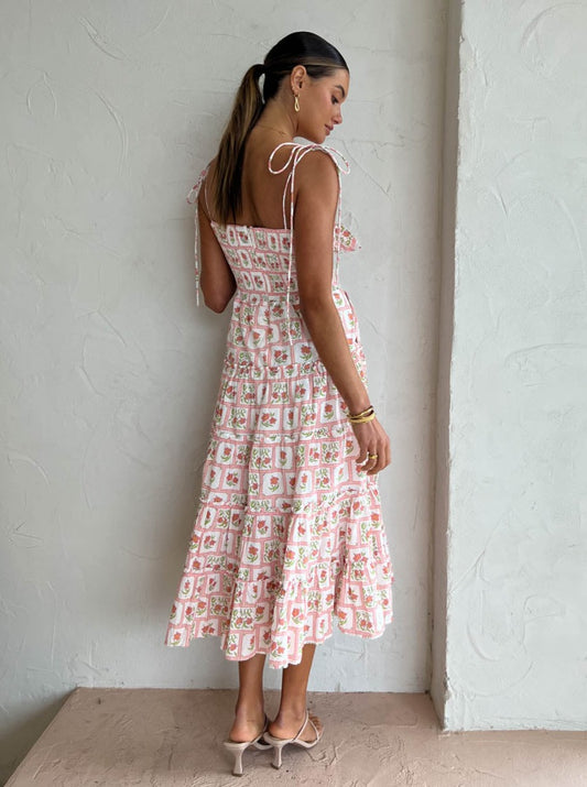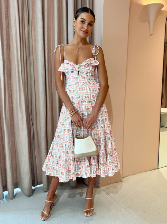 With the sweet and nostalgic print and flattering silhouette, this effortless midi dress is a go-to for special sun-kissed occasions.