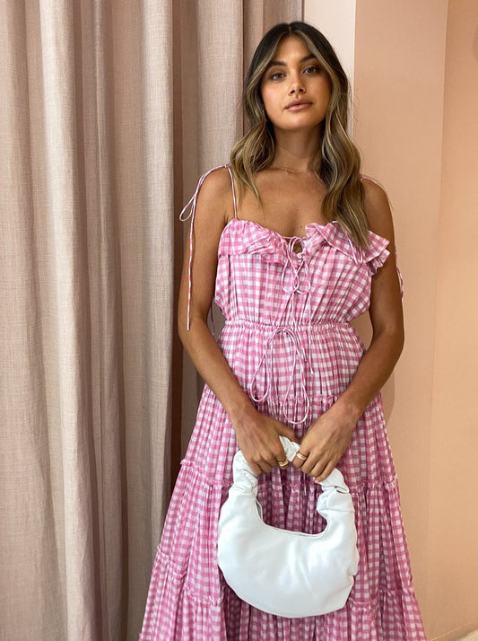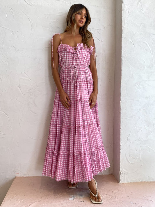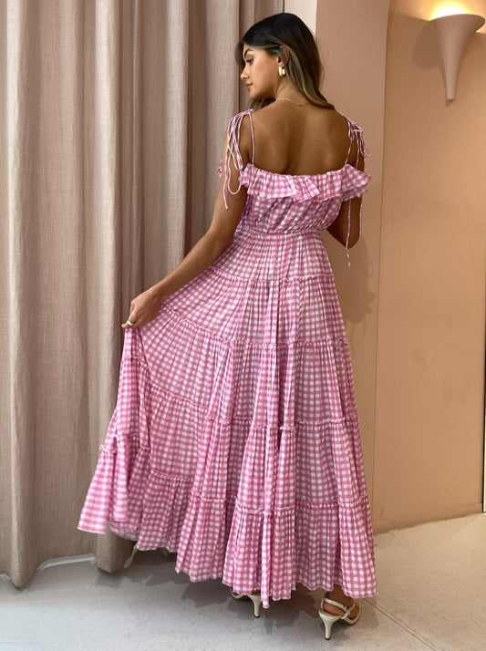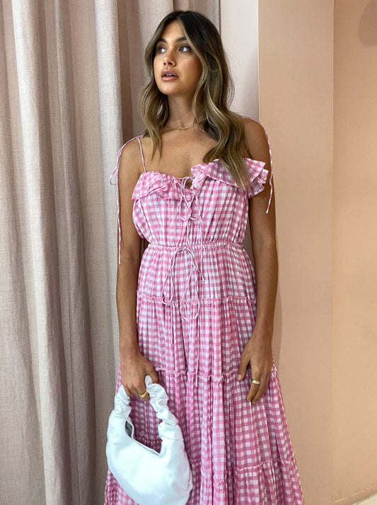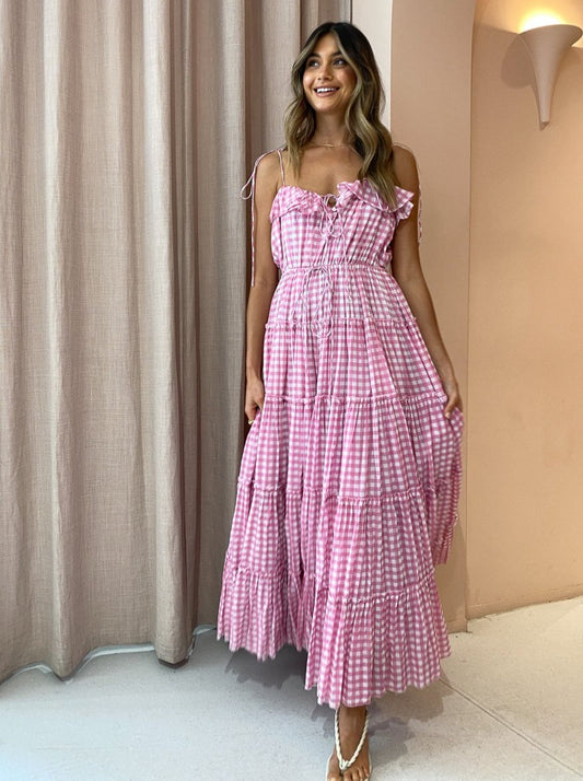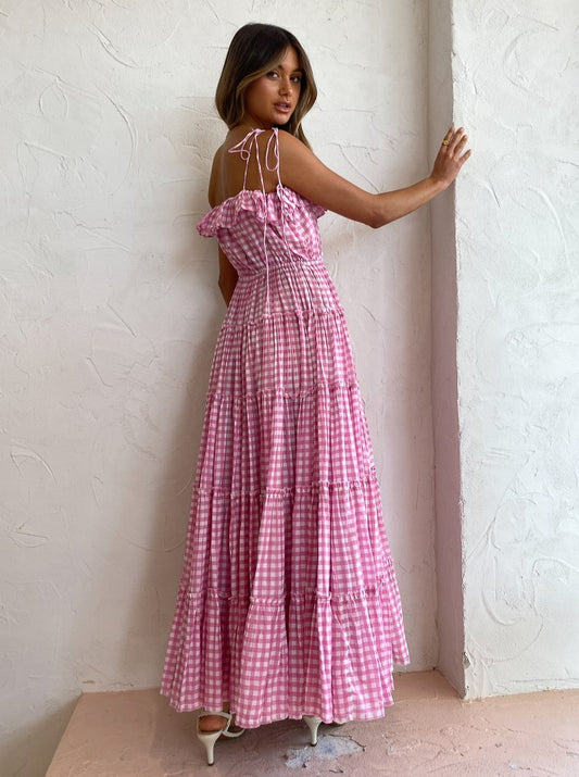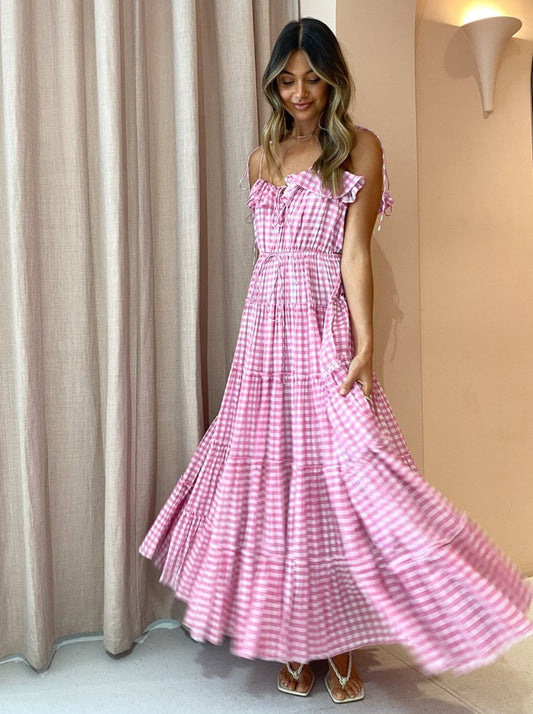 The sweet and feminine baby pink gingham print and 5 tiered skirt makes this maxi the perfect go-to for garden party soirees and sun-filled picnic dates.