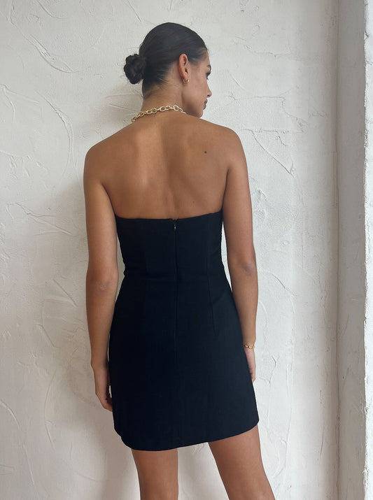 Thoughtfully crafted from a luxe linen fabrication, this mini dress features a strapless neckline with subtle side gathers.