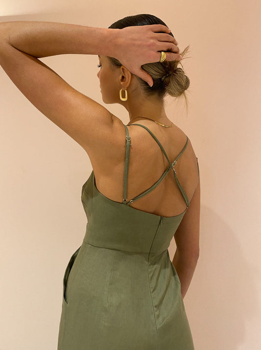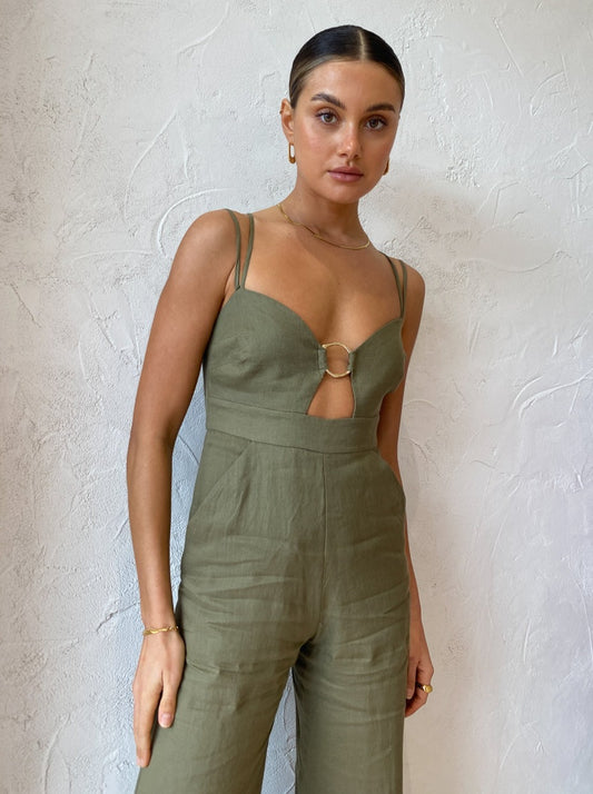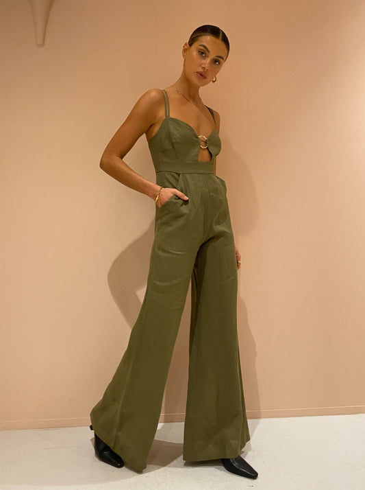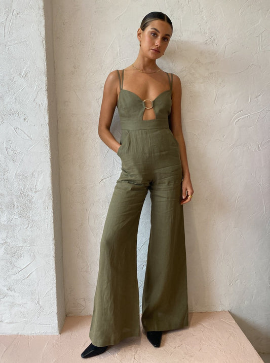 Thoughtfully crafted from a lightweight linen, this jumpsuit is lined and slim fitted throughout the bodice before falling into flattering wide leg pants. Featuring side seam pockets, adjustable thin double straps and statement gold O-Ring detail at the bust.