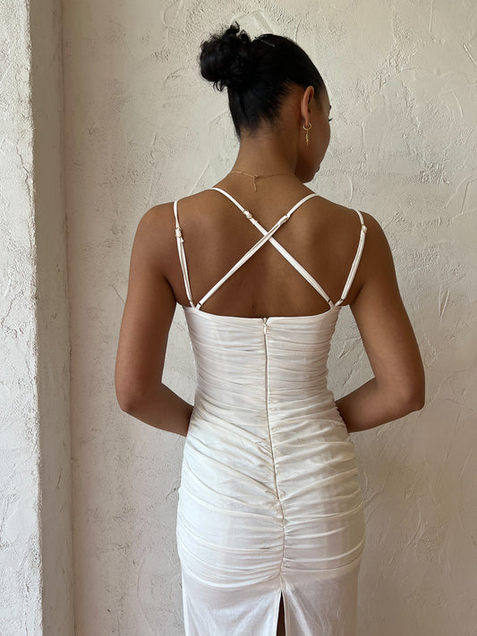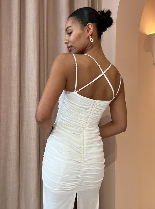 Crafted from a crisp white linen fabrication, this midi dress is designed to skim and flatter. With a statement square neckline its sits fitted at the bodice and features a ruched detailing before falling effortlessly into a midi length with statement side and back hem splits.