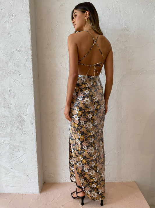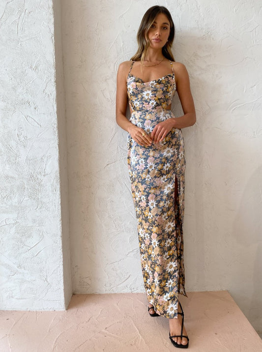 Filling our hearts with its stunning floral print and thigh high leg split, the Paloma will see you through birthday celebrations, wedding festivities and twilight cocktails.