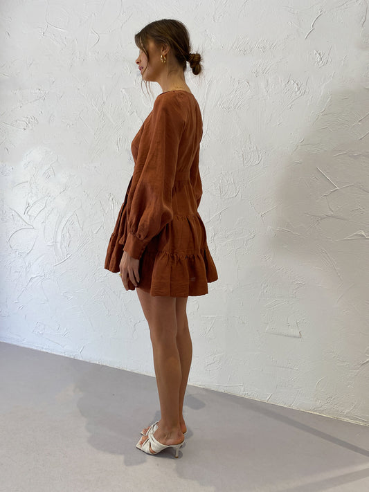 The rich gingerbread colour of the fabric, tiered shape and balloon sleeves makes this the ideal versatile midi to wear throughout the seasons.
