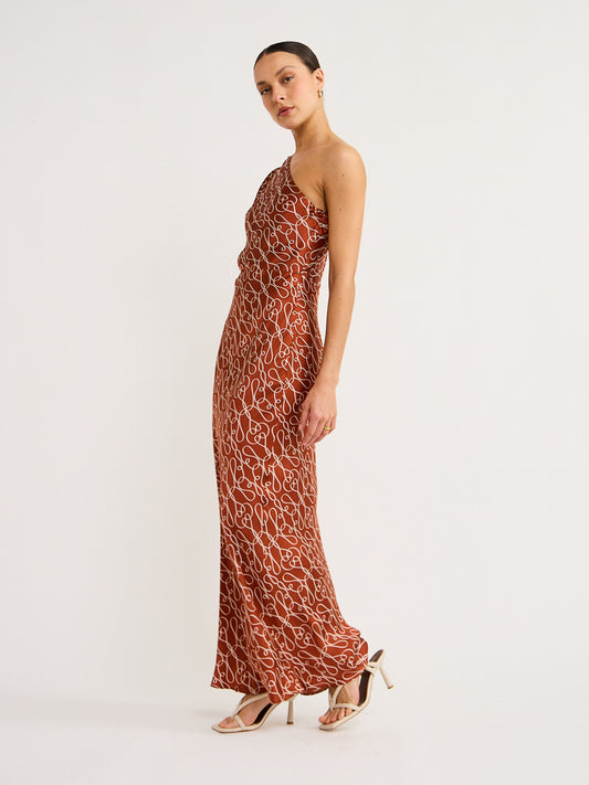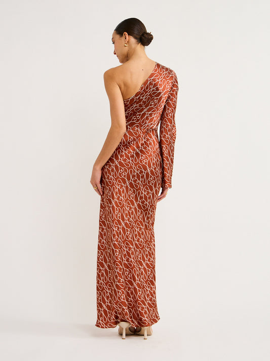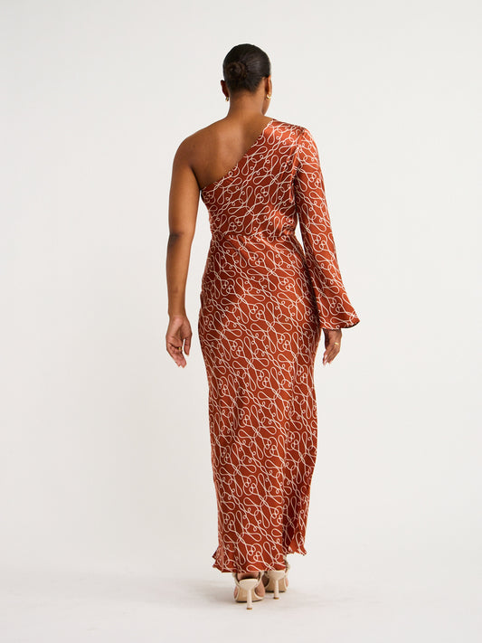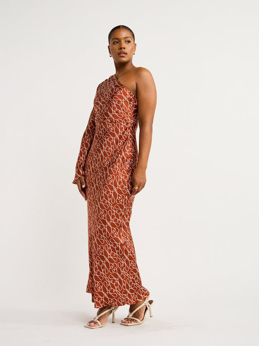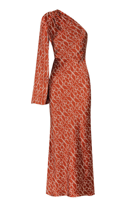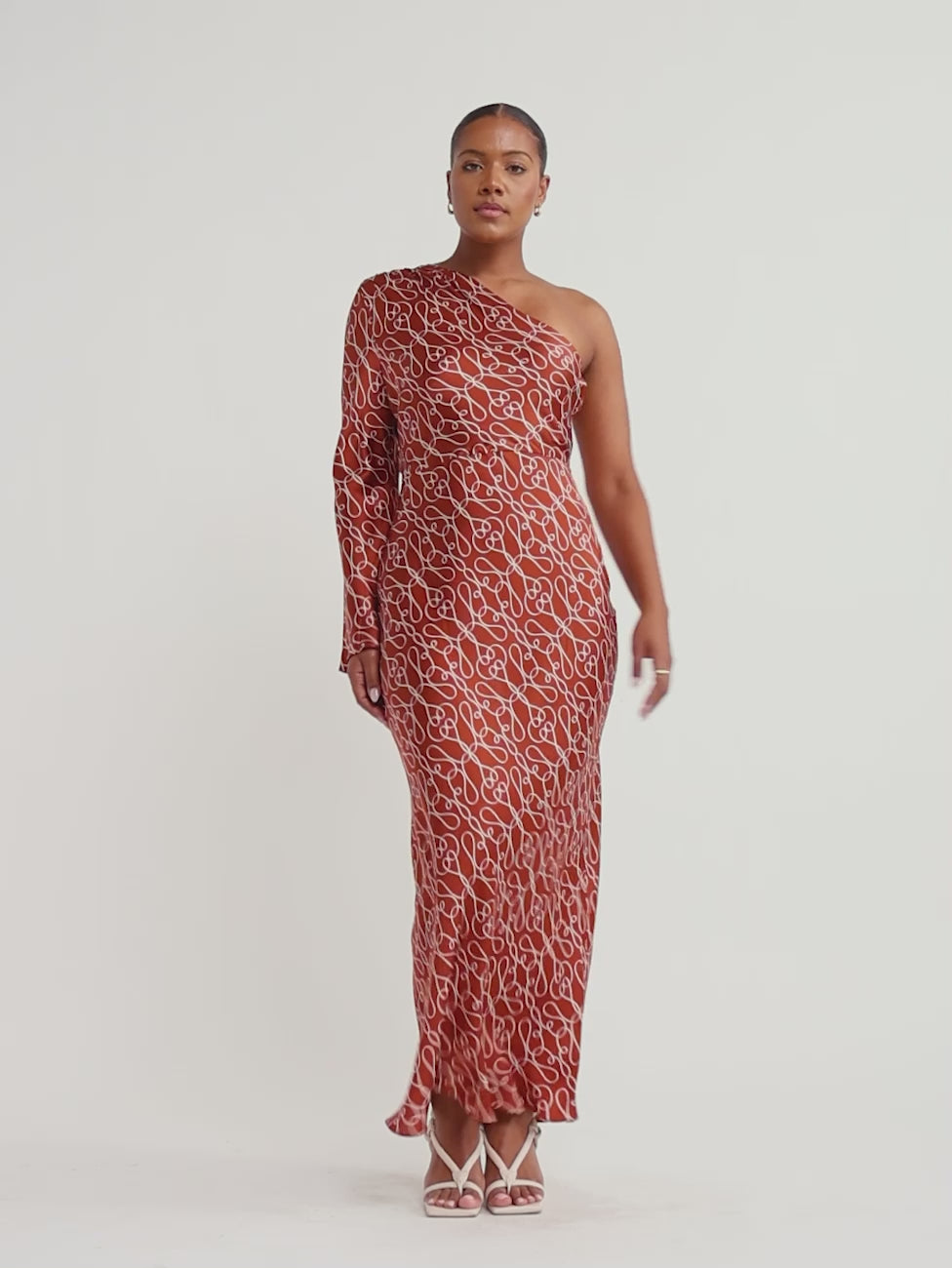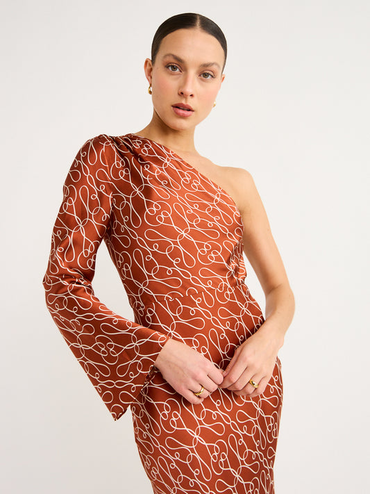 Shona Joy Artisti Silk One Shoulder Midi Dress in Brick/Cream