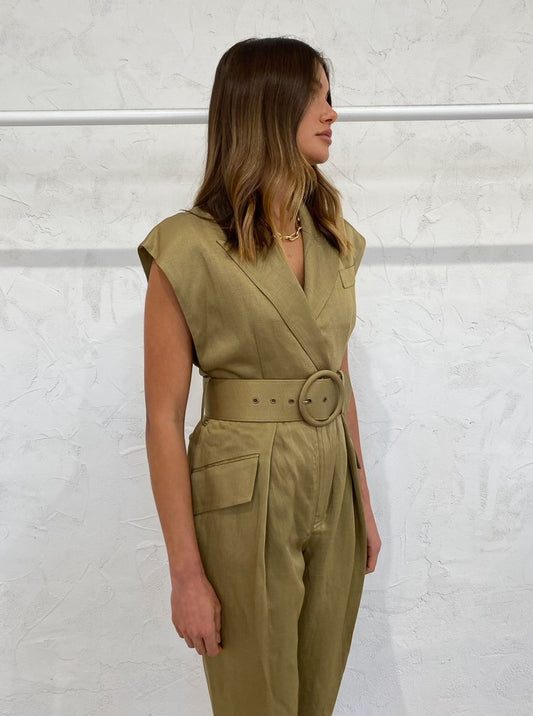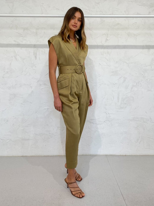The Shona Joy Bonita Fitted Jumpsuit in Olive is crafted from a natural linen blend fabric, featuring front pockets and a detachable belt.