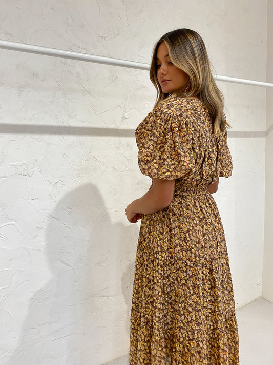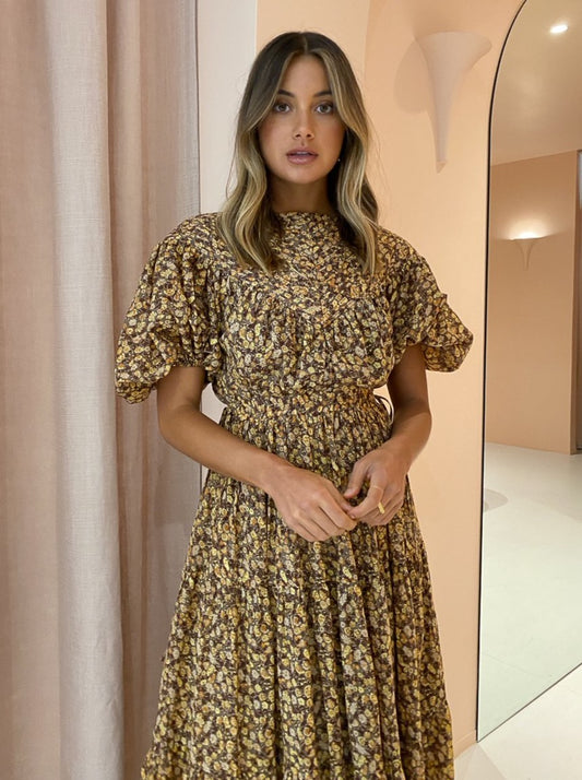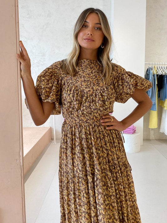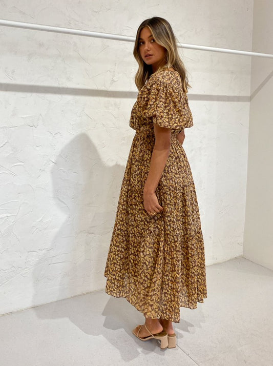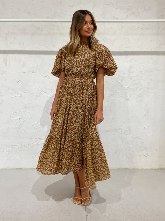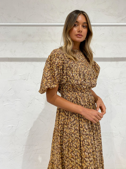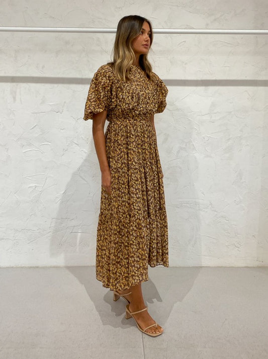 Shona Joy Fleur Pin Tuck Short Sleeve Midi Dress in Choc/Multi