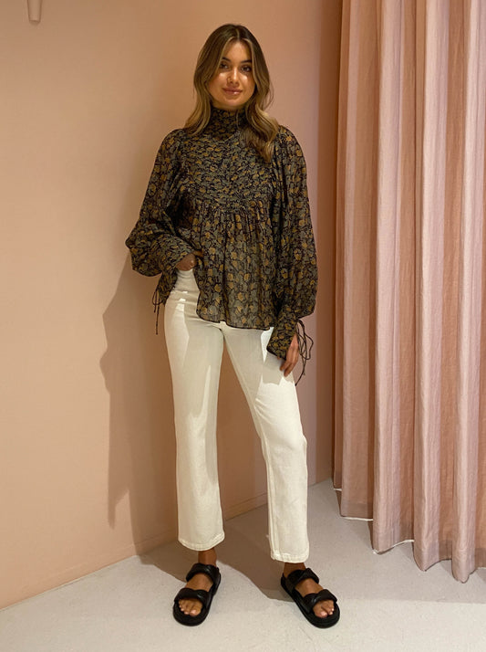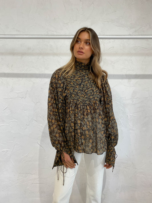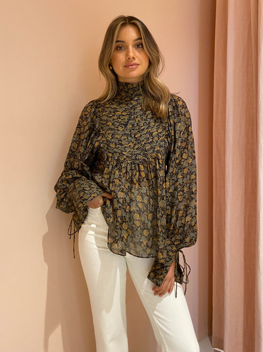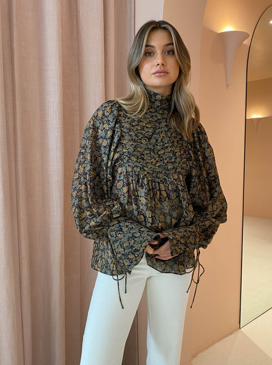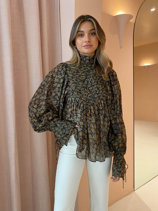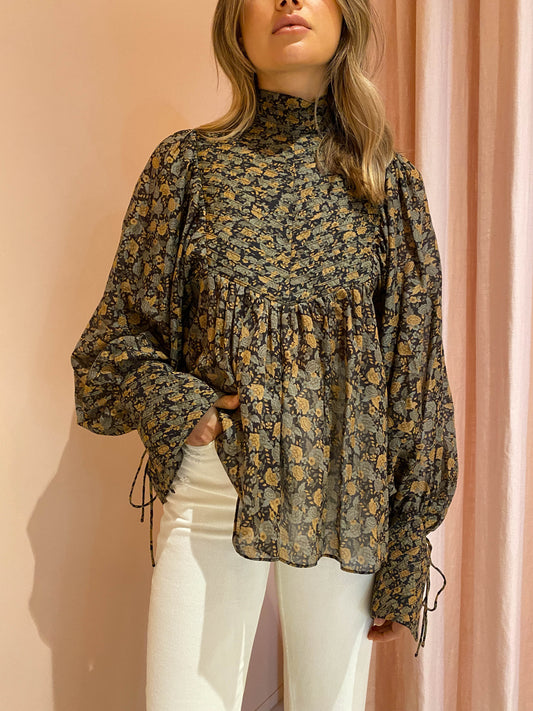 Light as a feather, this beautiful cotton voile shirt is crafted from an enchanting floral print, complimented by a high neckline and exaggerated balloon sleeves with string tie cuffs.