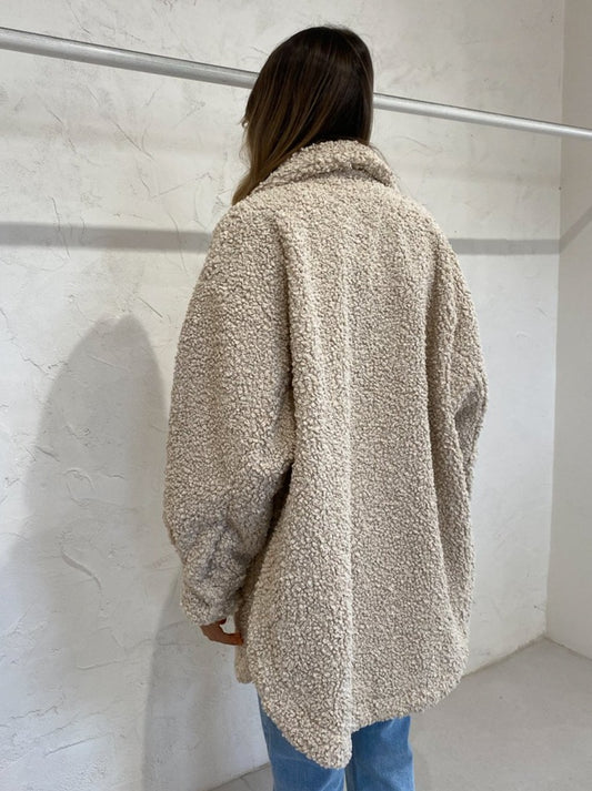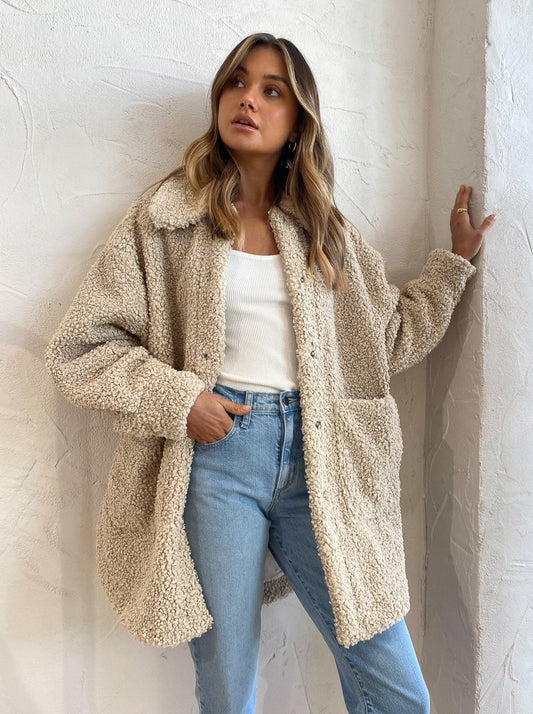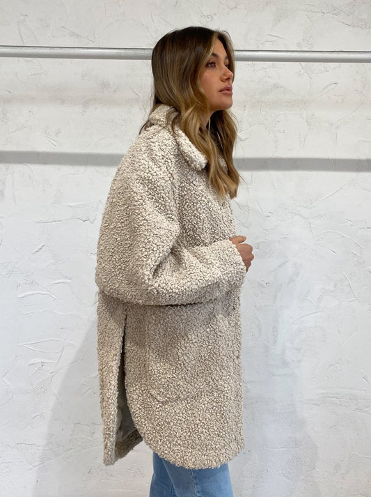Cut from a warming faux shirring in a relaxed and oversized shirt jacket silhouette, this versatile coat has been designed to layer and add comforting texture to elevate your look.