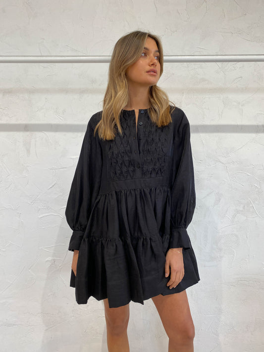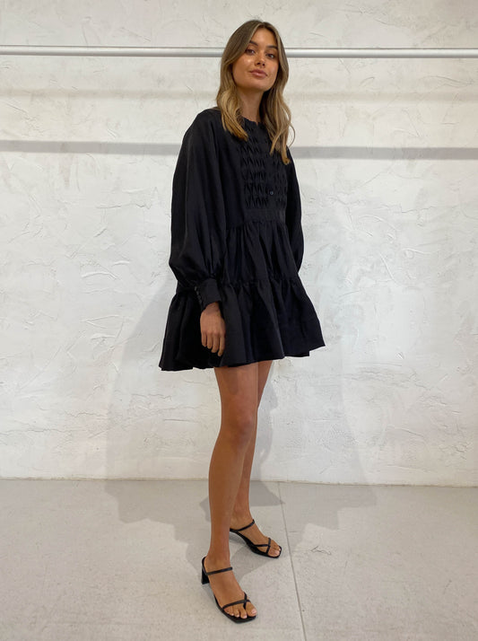 Femininity is embodied in every detail. Cut with a round neckline, this style features a front button tab, wave tuck detail on the front yoke, beautiful balloon sleeves with buttoned cuffs and a full tiered mini skirt with side pockets. It ticks all the Coco boxes!