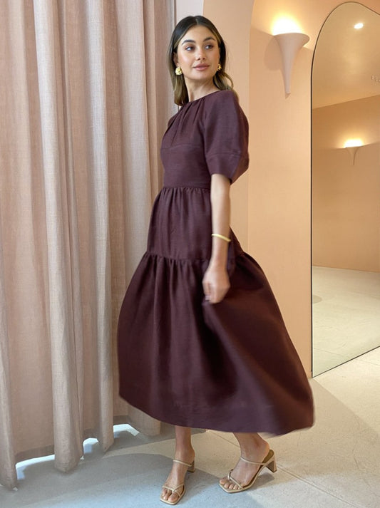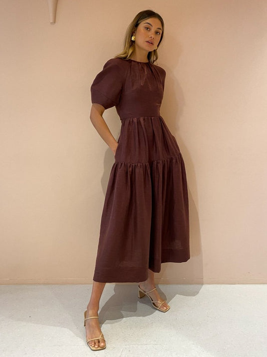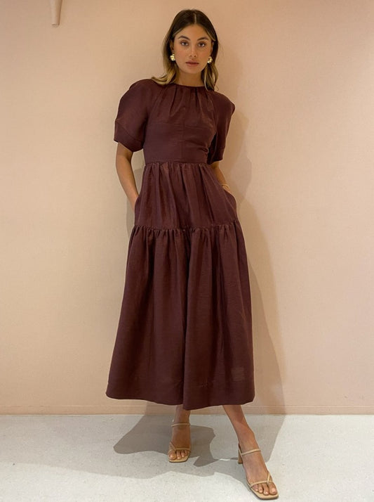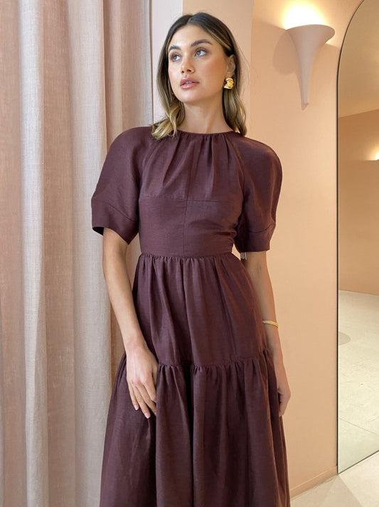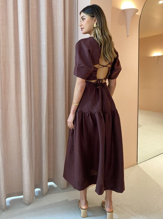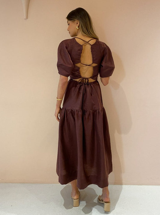 Indulge in femininity through delicate detailing and romantic voluminous silhouettes with the Marlene Open Back Midi Dress in Chocolate by Shona Joy.