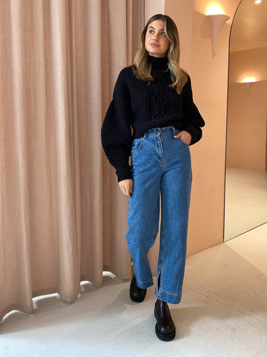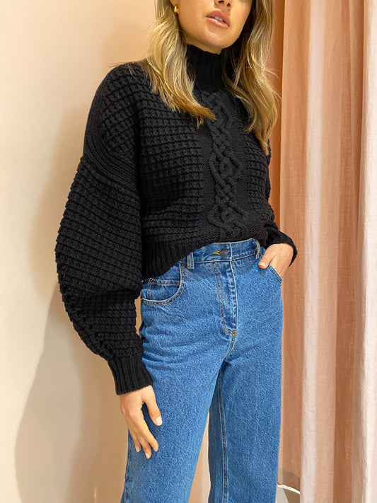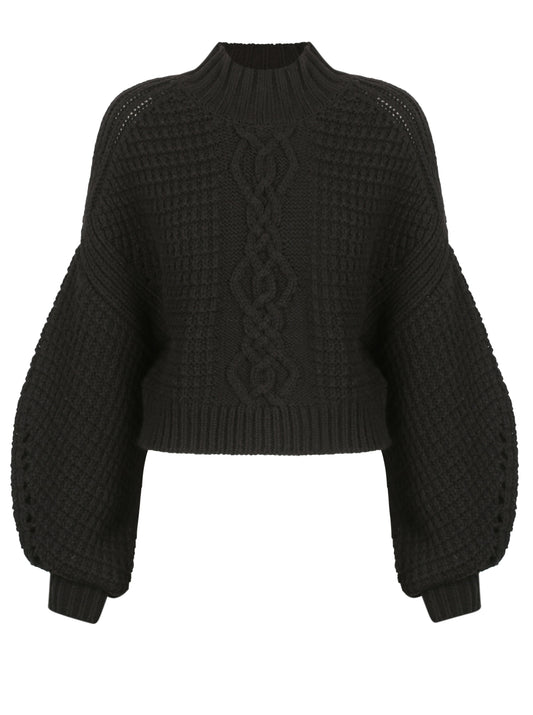 Featuring a high neckline, cable knit detail, drop shoulder that falls into a balloon sleeve and tapered ribbing detail at the neckline, hem and cuffs.